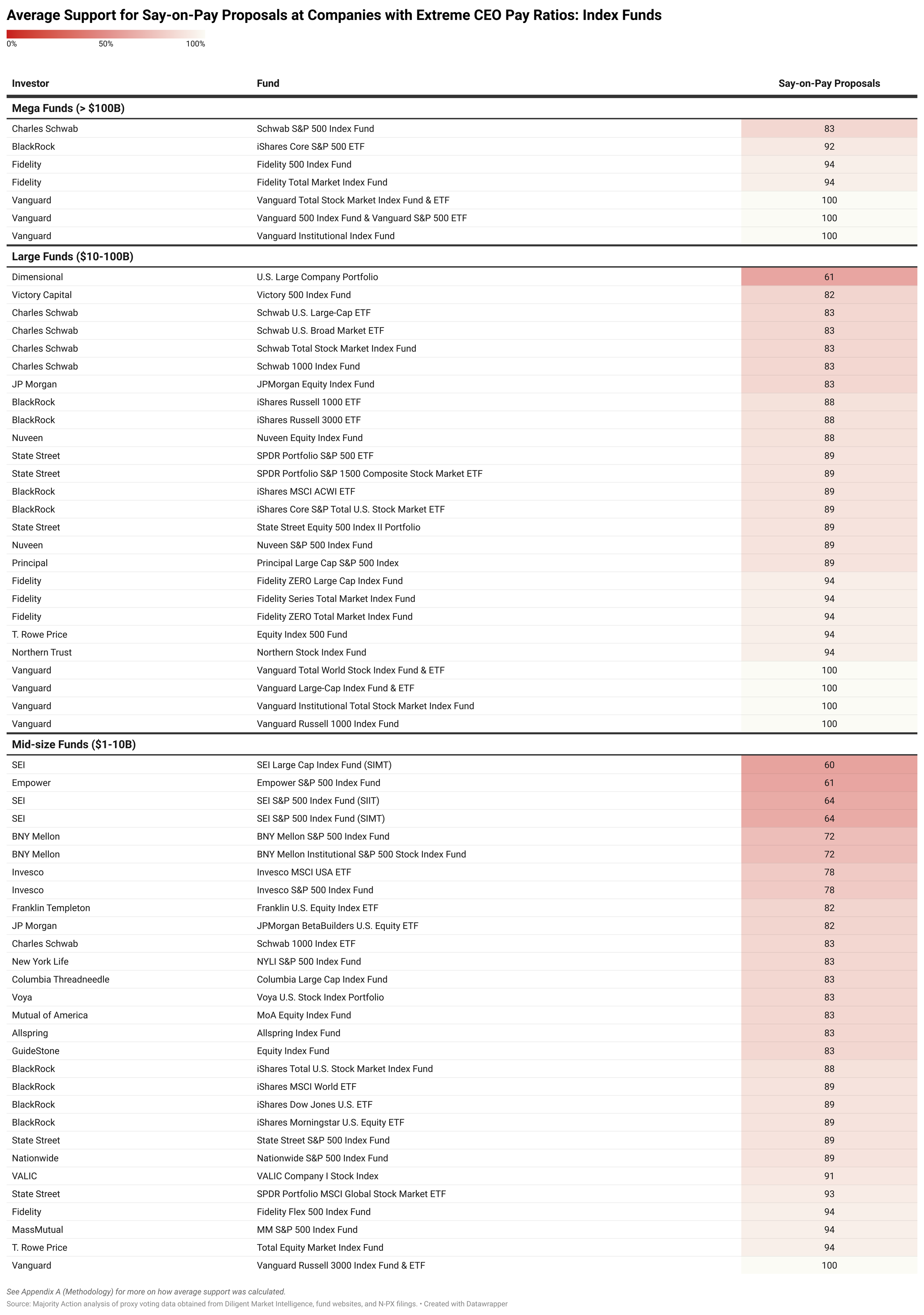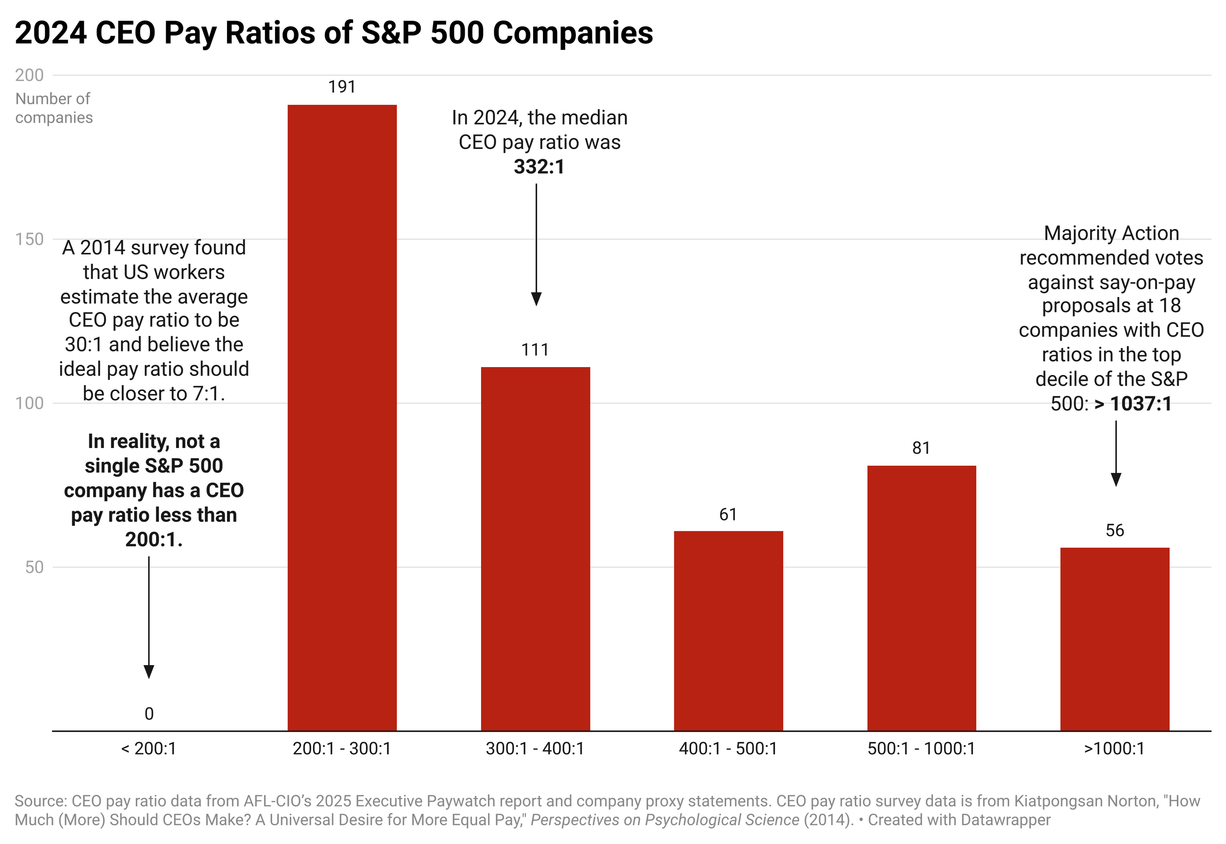 Majority Action examined how funds voted on say-on-pay proposals at S&P 500 companies with extreme levels of intra-firm inequality relative to their peers.¹⁹ In 2024, the median CEO pay ratio in the S&P 500 was 332:1. Our analysis focused on 18 companies whose CEO pay ratios ranked in the top decile of index participants ( > 1037:1). The worst offender was Starbucks, where the CEO pay ratio is an astounding 6,666:1 and where 12,000 unionized workers have been fighting for a first contract for over four years.²⁰