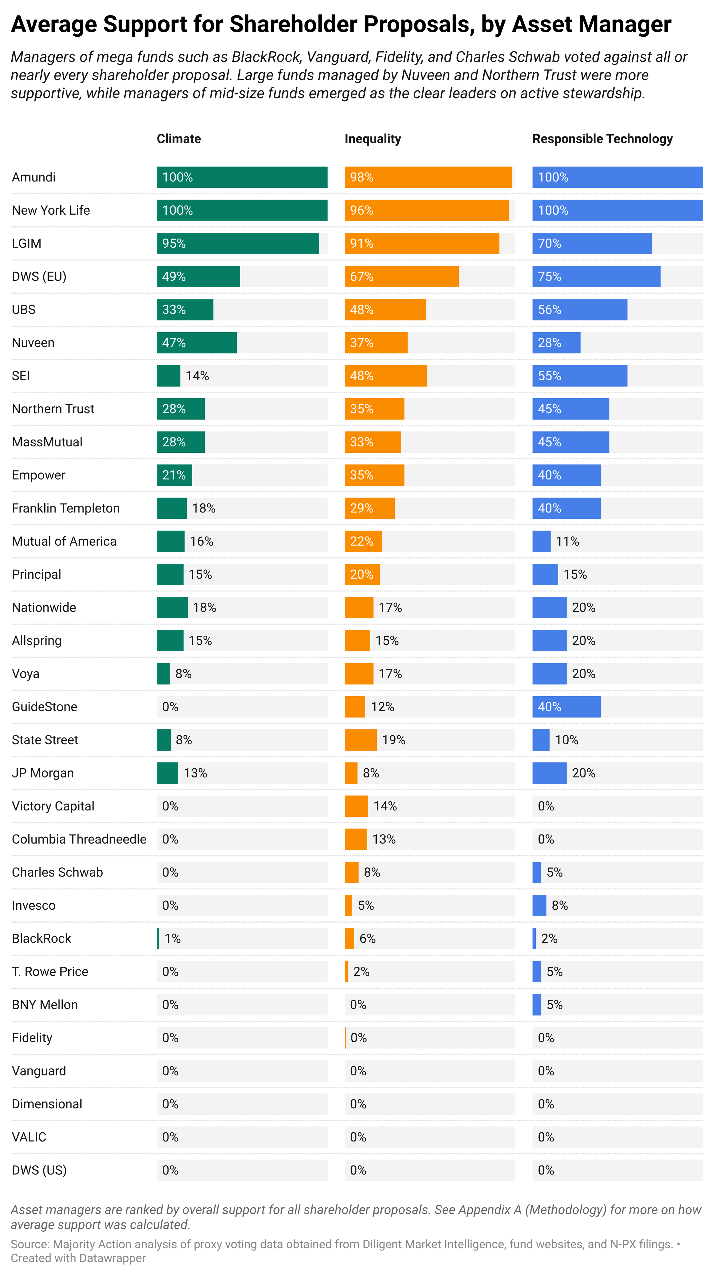 Comparing across categories, funds were generally less supportive of climate proposals than they were of inequality or unaccountable technology proposals. Nuveen was the only asset manager whose average support for climate proposals exceeded its average support for inequality and unaccountable technology proposals. In particular, fund managers appear to be increasingly concerned about curbing AI’s negative externalities and ensuring there is board accountability for AI oversight. Eleven US-based funds supported on average 40% or more of unaccountable technology proposals, indicating an openness to implementing AI guardrails and a desire to limit the excesses wrought by today’s tech monopolies.