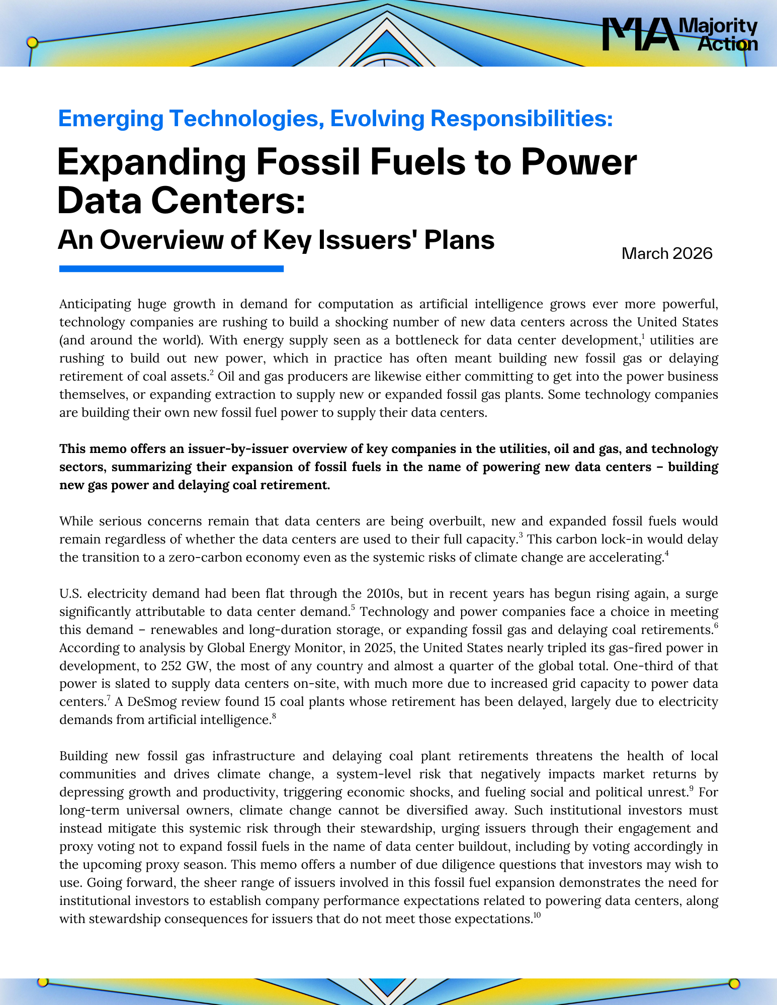 This memo offers an issuer-by-issuer overview of key companies in the utilities, oil and gas, and technology sectors, summarizing their plans to expand fossil fuels to power new data centers – building new gas power and delaying coal retirement. It also includes an analysis of "behind-the-meter" fossil gas buildout, as well as due diligence questions for investors to ensure their stewardship practices are mitigating the risks of data center buildout.