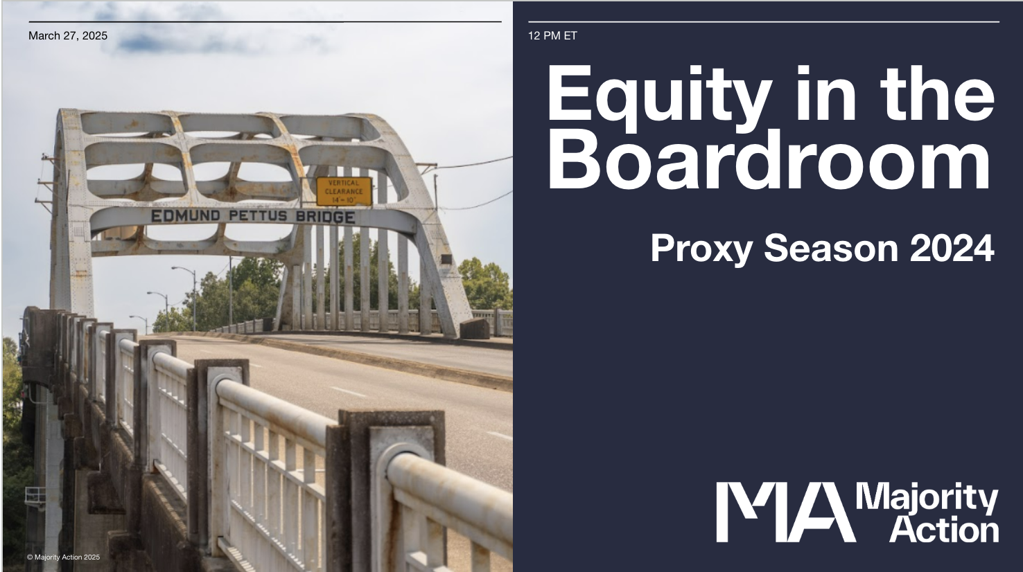 In March 2025, we hosted a webinar on our Equity in the Boardroom: 2024 Proxy Season Report. Watch Divya Sundar, Majority Action’s Director of Research, dive deeper into the report’s key findings and recommendations for asset managers and asset owners.