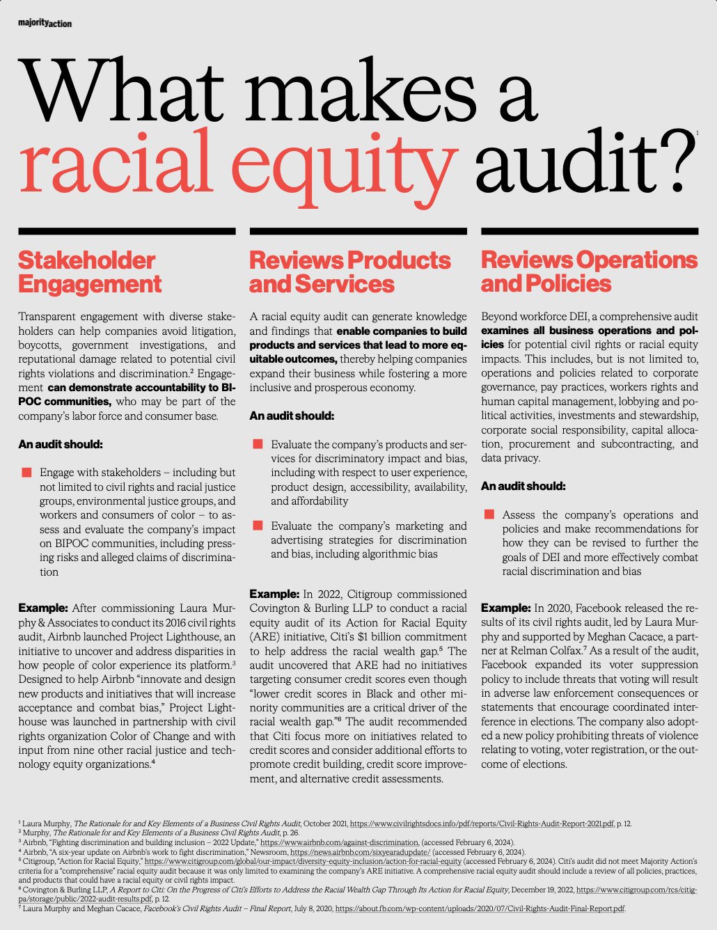 Fact Sheet. This fact sheet outlines the key elements of a high-quality racial equity audit, offering guidance to companies to conduct independent thorough, transparent, and actionable civil rights evaluations.
