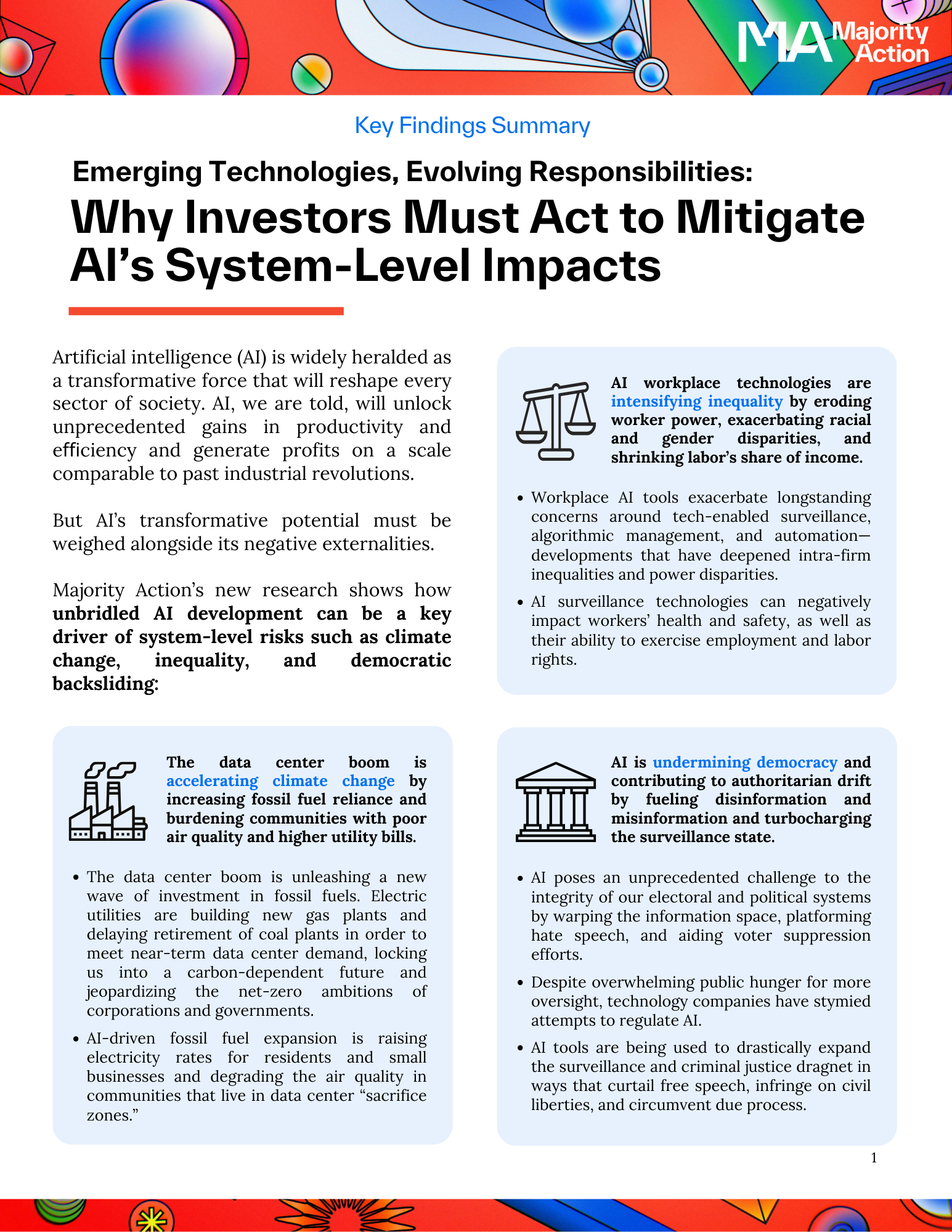 Report - September 2025: Emerging Technologies, Evolving Responsibilities: Why Investors Must Act to Mitigate AI’s System-Level Impacts highlights how unprecedented AI development is creating non-diversifiable, system-level risks that threaten long-term returns and shared prosperity, and presents actionable steps universal owners can take to adopt responsible AI guardrails and protect long-term value.